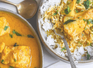 Ajoutez des légumes dans le plat si vous le souhaitez (ex : courgettes, carottes, pois mange tout, etc…) soit pré-cuits soient ajoutés en amont du poisson dans la sauce et laissés mijoter pour les cuire.